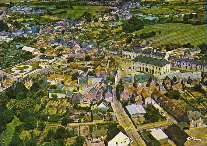 Vue aérienne, la place des Halles et la grande rue