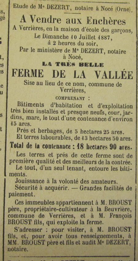 Vente de la ferme de la Vallée (1887)