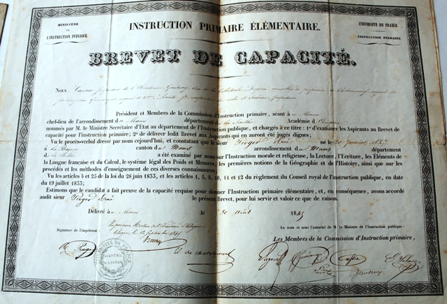Brevet de capacité délivré le 30/08/1845 (A.D.S. 1 T 71).